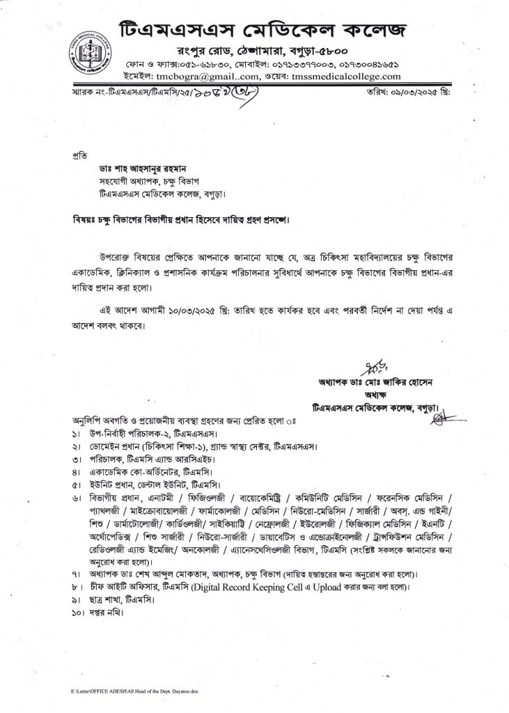 চক্ষু বিভাগের বিভাগীয় প্রধান