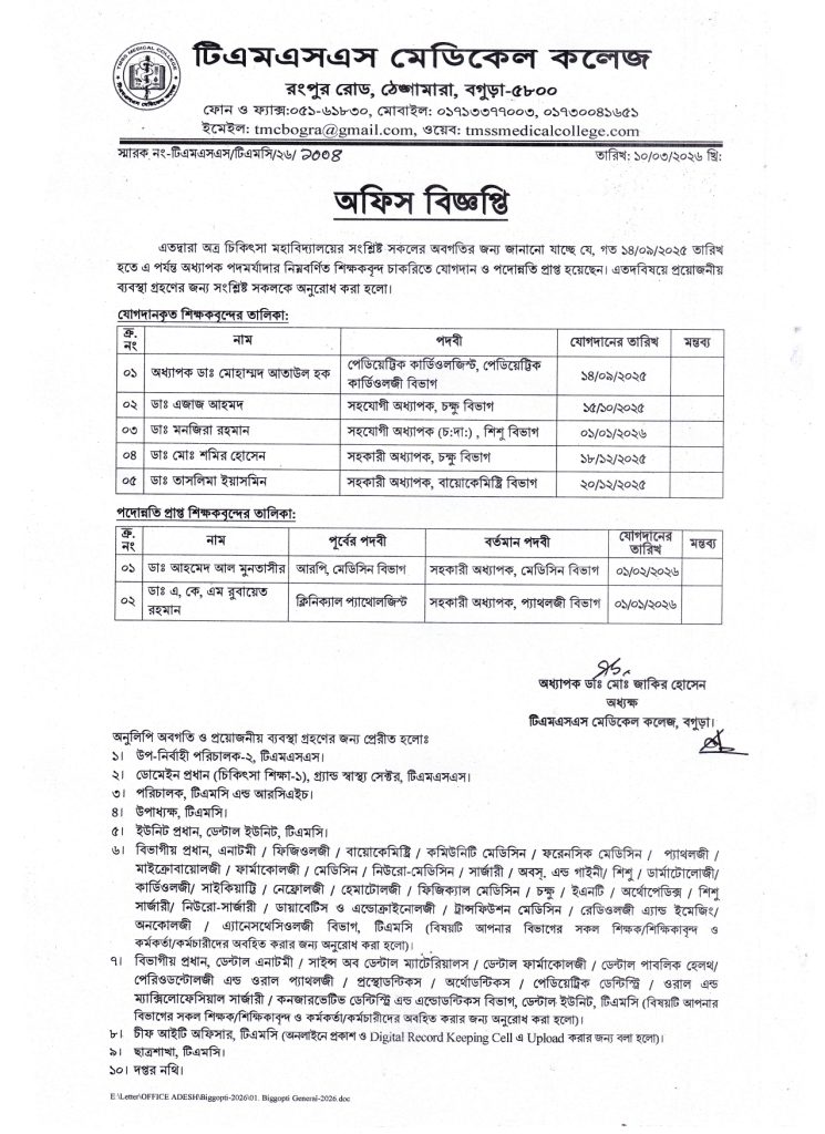 নতুন যোগদান ও পদোন্নতিপ্রাপ্ত শিক্ষকবৃন্দ সংক্রান্ত সার্কুলার
