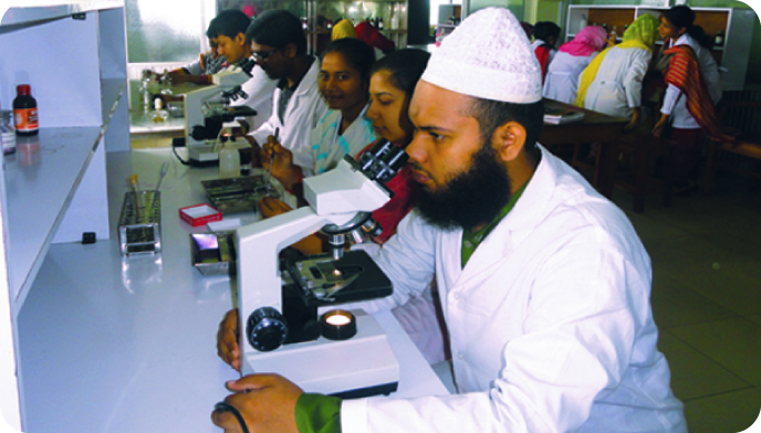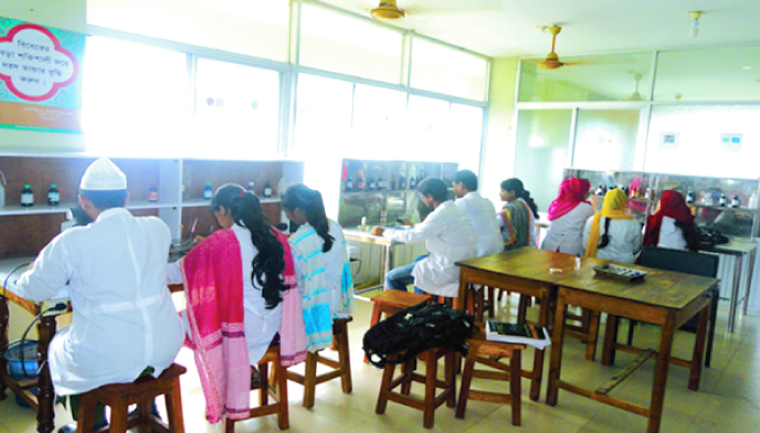 Practical class room: Floor spaces for 40 students are available in the college building with adequate sitting arrangement, benches with water & electric point, macrospore, light, burner, refrigerator, shelves & racks.